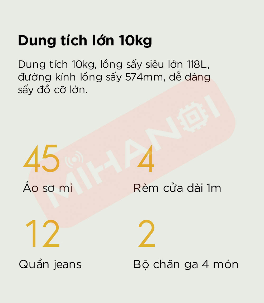 - Dung tích lớn 10kg – lồng sấy 118L, đáp ứng nhu cầu sấy quần áo của gia đình 4 người trong một lần.