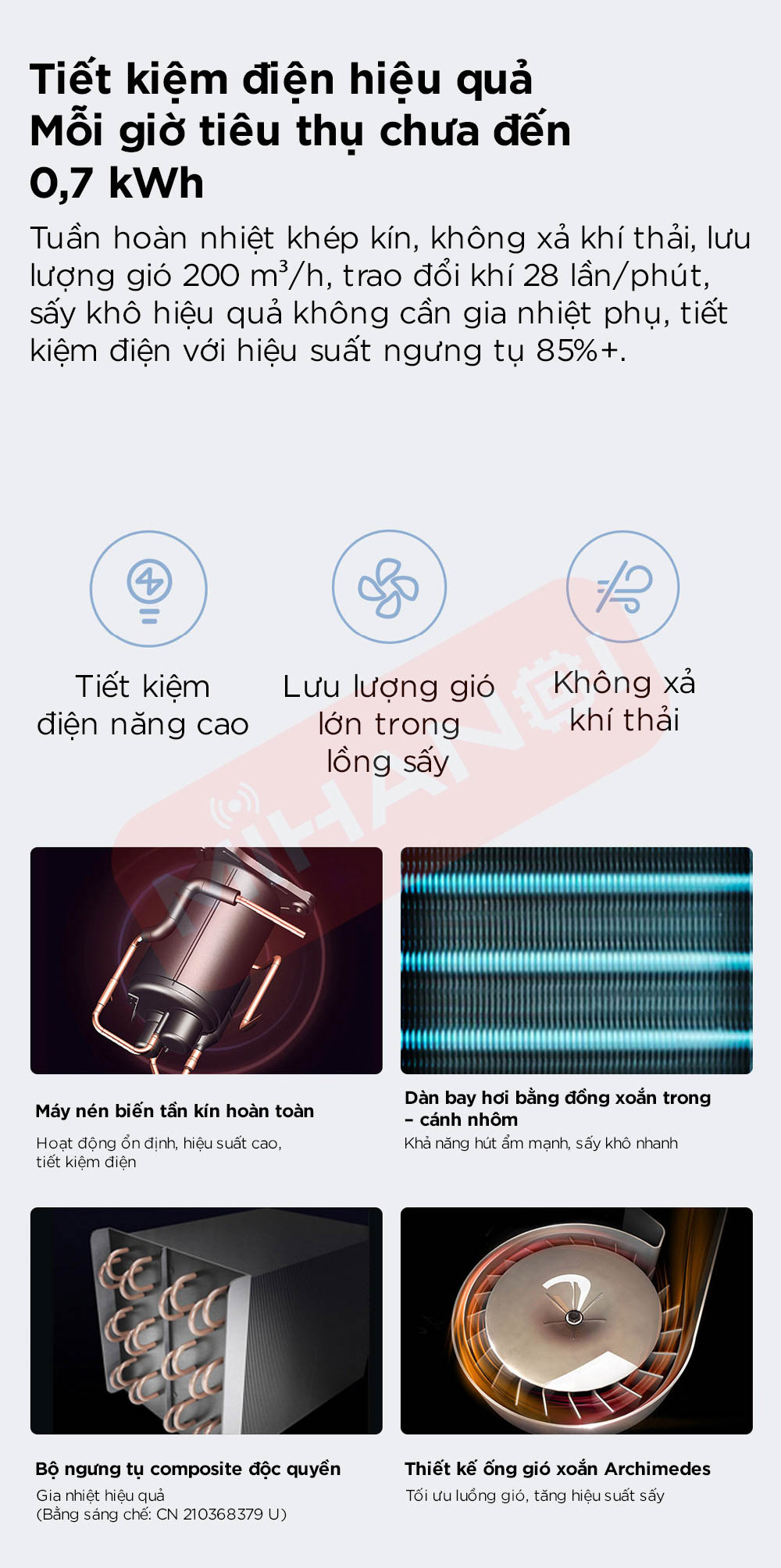 - Tiết kiệm điện hiệu quả, mỗi giờ tiêu thụ chưa đến 0,7 kWh với hiệu suất ngưng tụ lên đến 85%+.