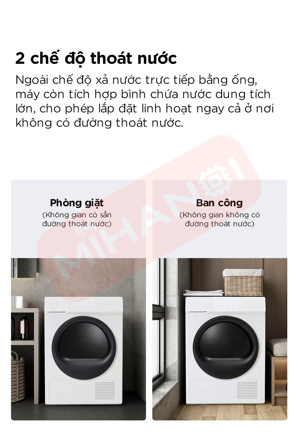 - Hai chế độ thoát nước linh hoạt, xả trực tiếp hoặc dùng bình chứa, dễ lắp đặt ở nhiều không gian.