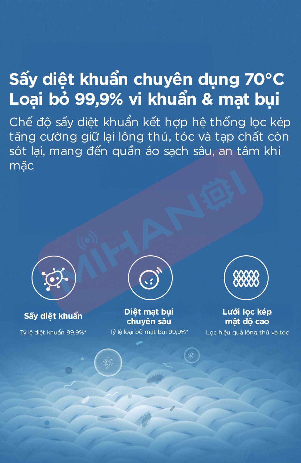 - Chế độ sấy diệt khuẩn 70°C kết hợp hệ thống lọc kép, diệt khuẩn và khử mạt bụi lên đến 99,9%.