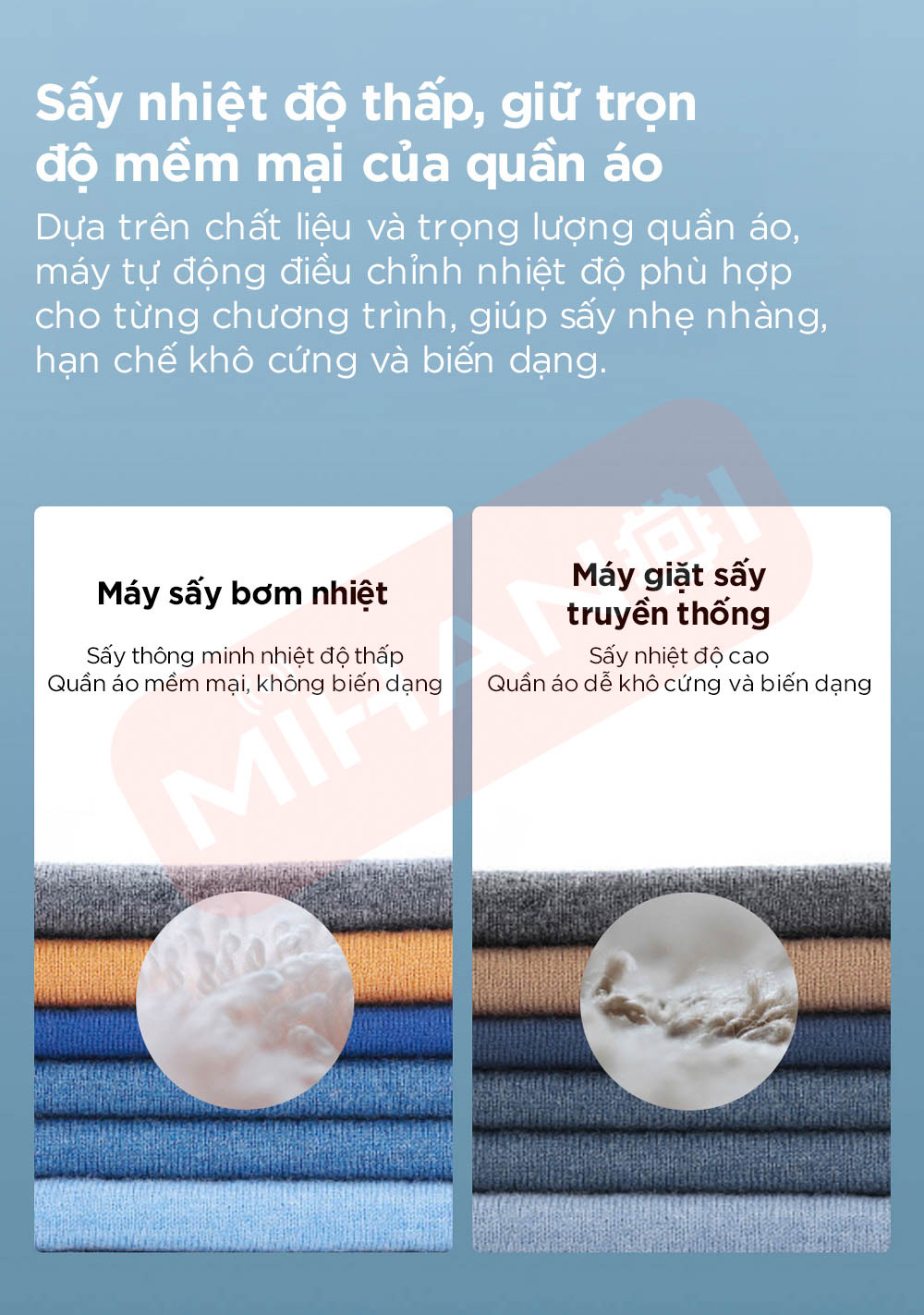 - Công nghệ sấy bơm nhiệt nhiệt độ thấp giúp quần áo khô hiệu quả mà vẫn giữ được độ mềm mại tự nhiên của sợi vải.
