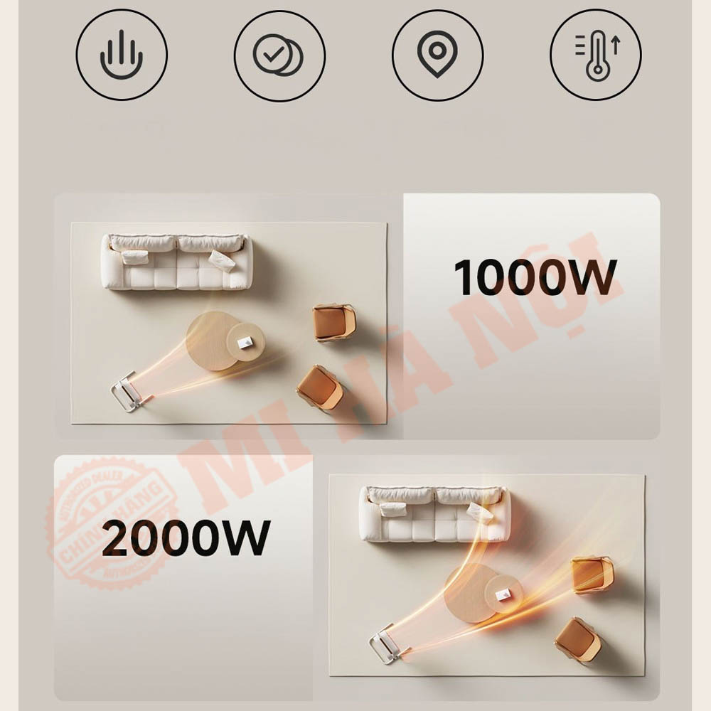 Hai mức công suất 1000W và 2000W, đáp ứng linh hoạt nhu cầu sưởi ấm cục bộ hoặc toàn phòng.