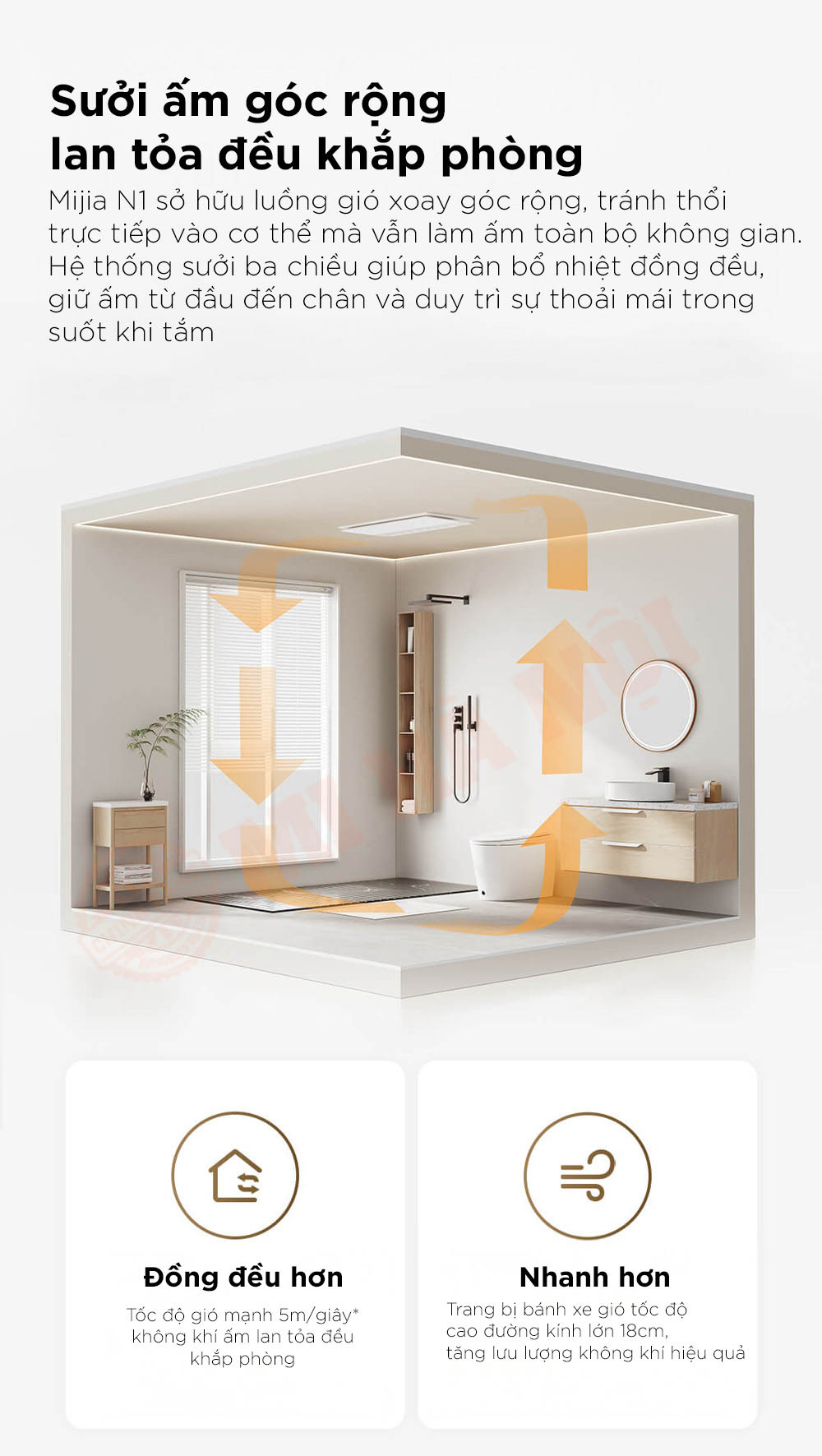 Máy sưởi nhà tắm Xiaomi Mijia N1 mang đến giải pháp sưởi ấm và thông gió tối ưu cho không gian phòng tắm. Thiết bị sử dụng công nghệ Graphene làm nóng nhanh, lan tỏa hơi ấm đồng đều và duy trì nhiệt độ ổn định nhờ chuyển đổi tần số thông minh, giúp tiết kiệm năng lượng hiệu quả. Hệ thống khử mùi ẩm mốc bằng nhóm plasma triệu cấp kết hợp khả năng khử trùng, diệt khuẩn, đảm bảo không gian luôn sạch sẽ và an toàn.