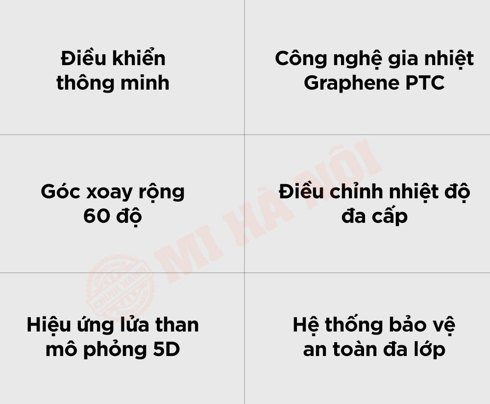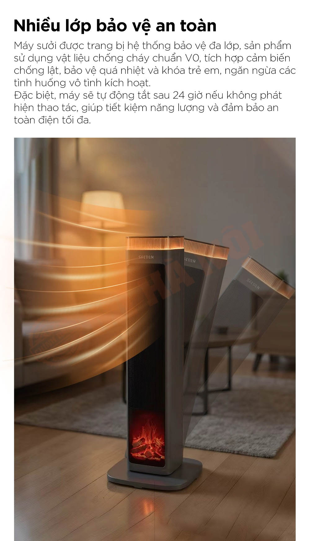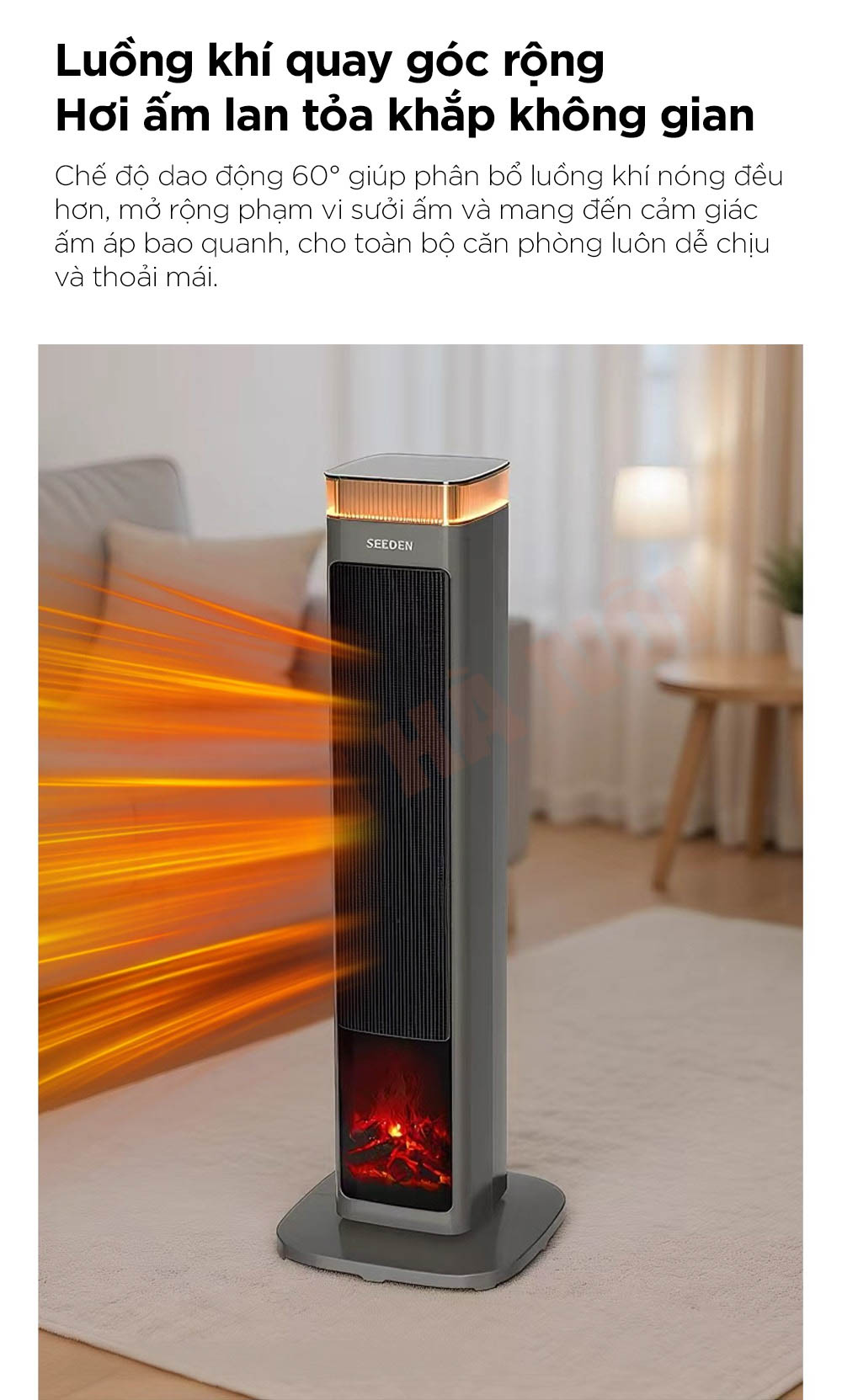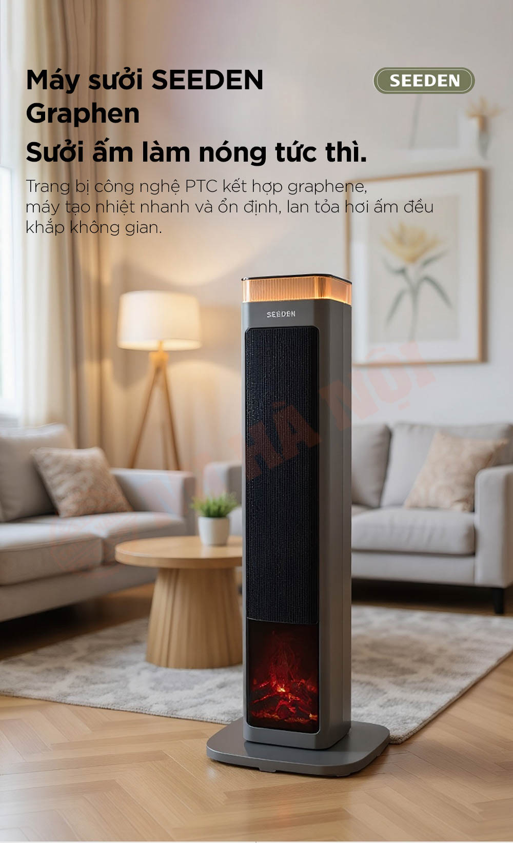 Máy sưởi SEEDEN Graphene nổi bật với công nghệ gia nhiệt kép PTC + Graphene, làm nóng tức thì và lan tỏa hơi ấm đều khắp không gian. Trang bị điều khiển AI thông minh, chế độ ECO tiết kiệm điện và khả năng dao động góc rộng 60° giúp phân bổ nhiệt hiệu quả. Thiết kế lò sưởi mô phỏng 5D cùng hệ thống bảo vệ an toàn đa lớp mang đến trải nghiệm ấm áp, tiện nghi và an toàn tuyệt đối cho người dùng.
