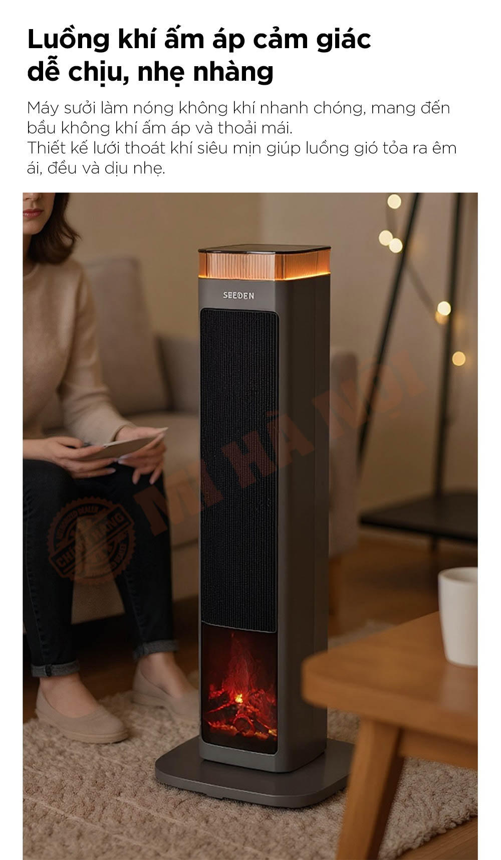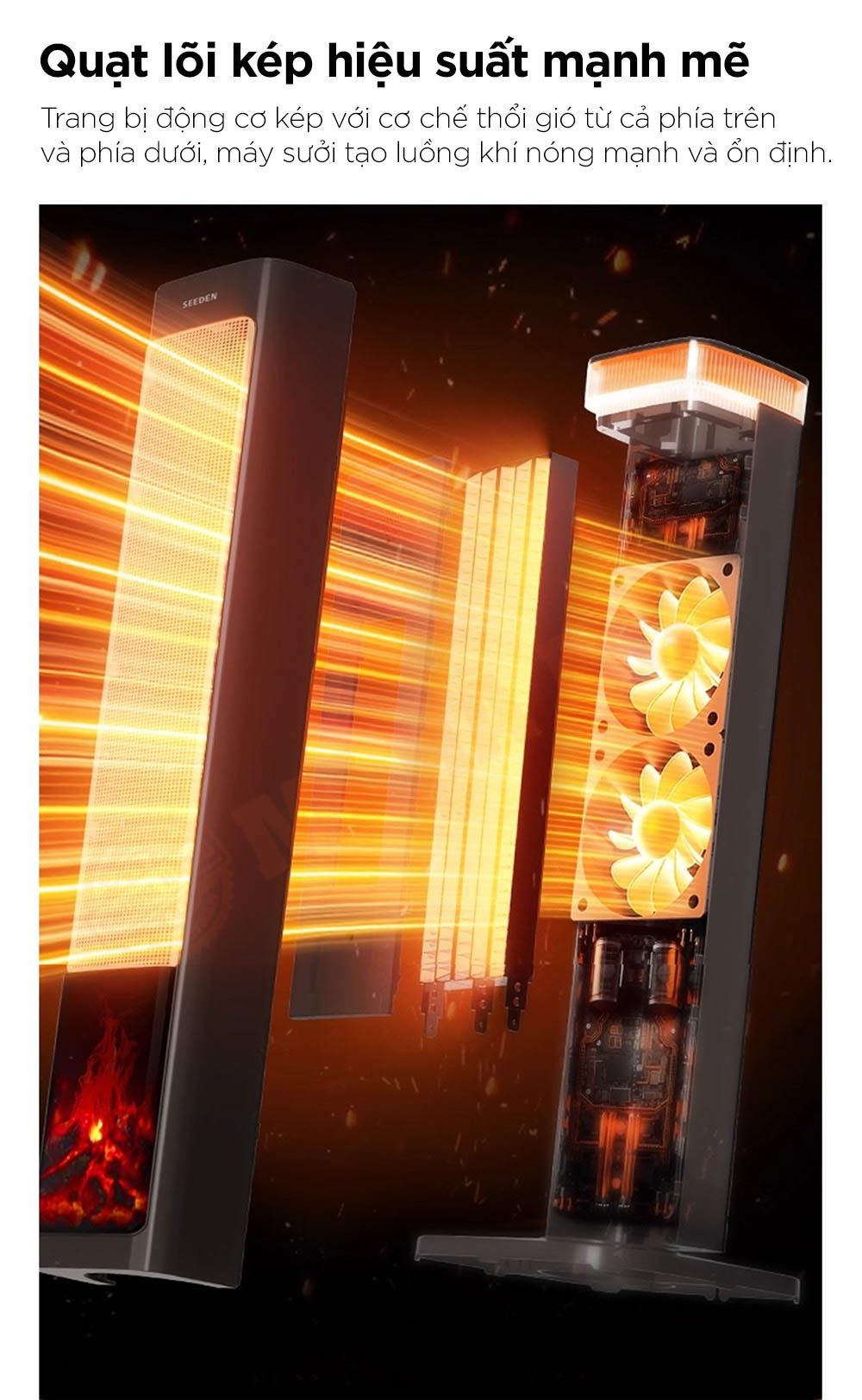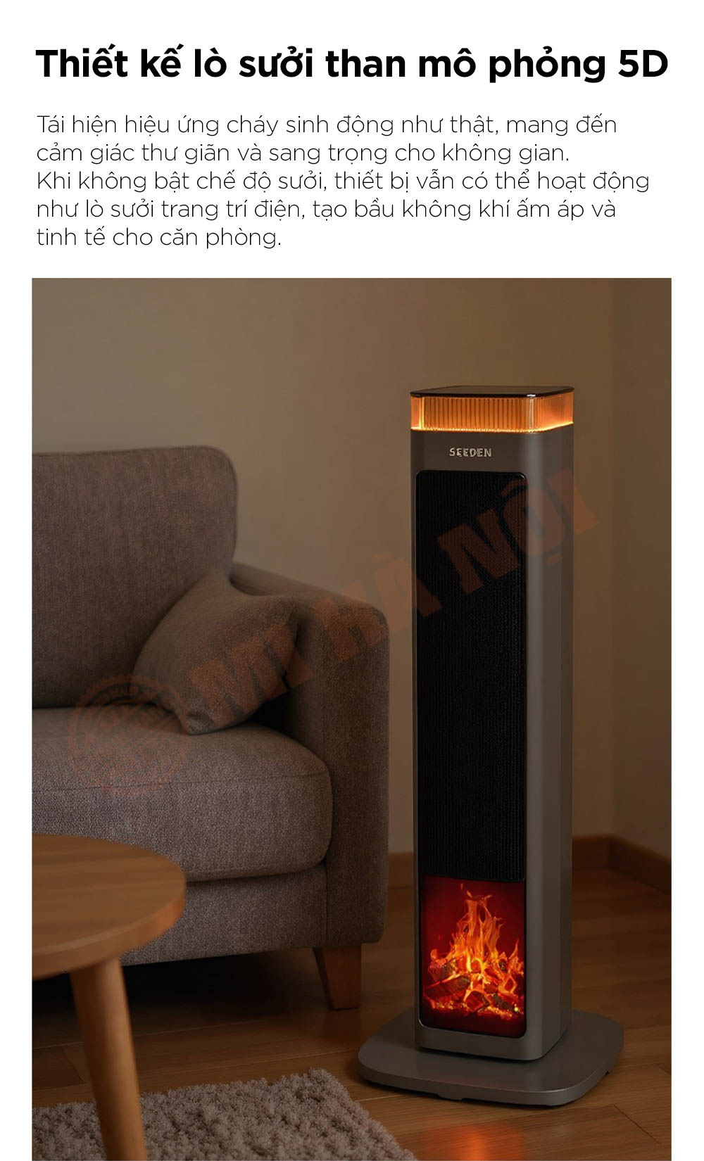 Máy sưởi SEEDEN Graphene nổi bật với công nghệ gia nhiệt kép PTC + Graphene, làm nóng tức thì và lan tỏa hơi ấm đều khắp không gian. Trang bị điều khiển AI thông minh, chế độ ECO tiết kiệm điện và khả năng dao động góc rộng 60° giúp phân bổ nhiệt hiệu quả. Thiết kế lò sưởi mô phỏng 5D cùng hệ thống bảo vệ an toàn đa lớp mang đến trải nghiệm ấm áp, tiện nghi và an toàn tuyệt đối cho người dùng.
