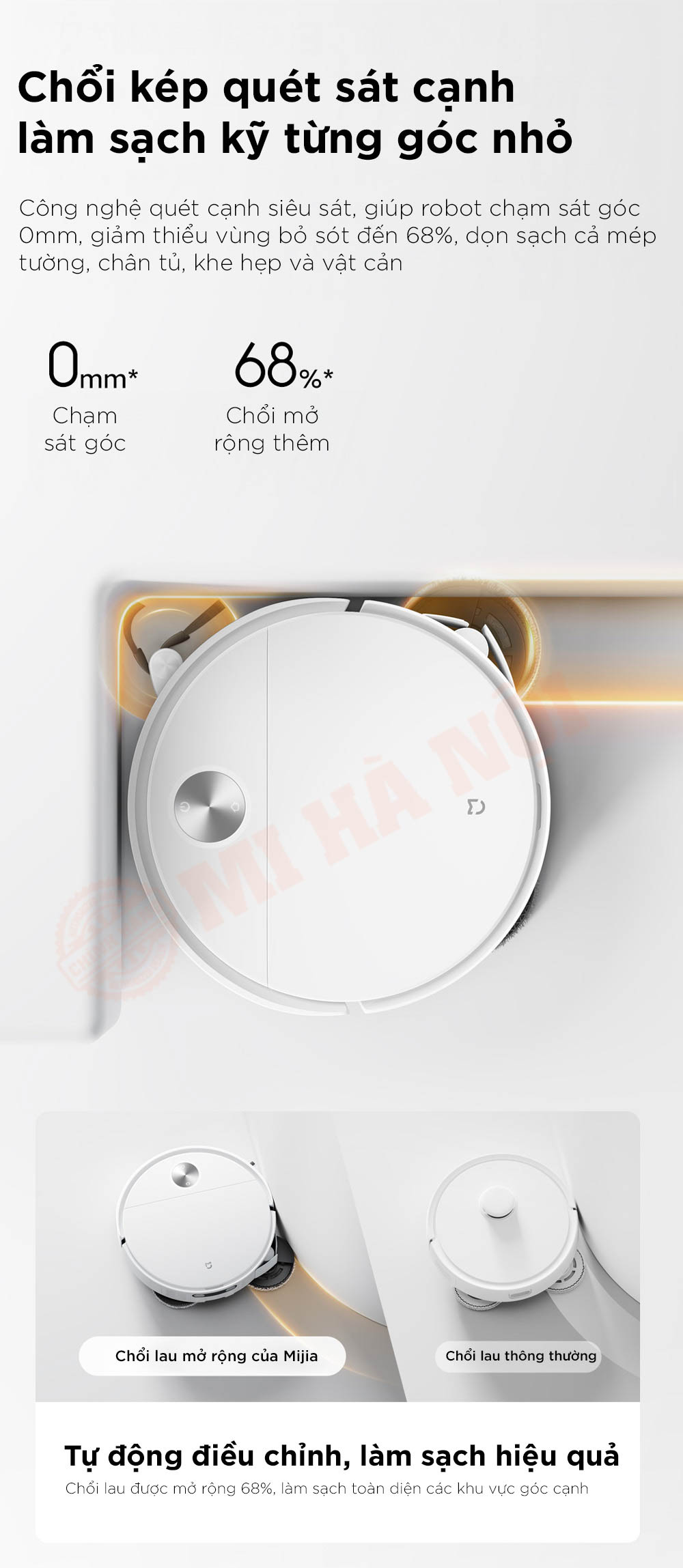 - Quét và lau sát tường 0mm – Cặp chổi kép làm sạch kỹ mép tường, góc hẹp, giảm bỏ sót bụi tới 68%.