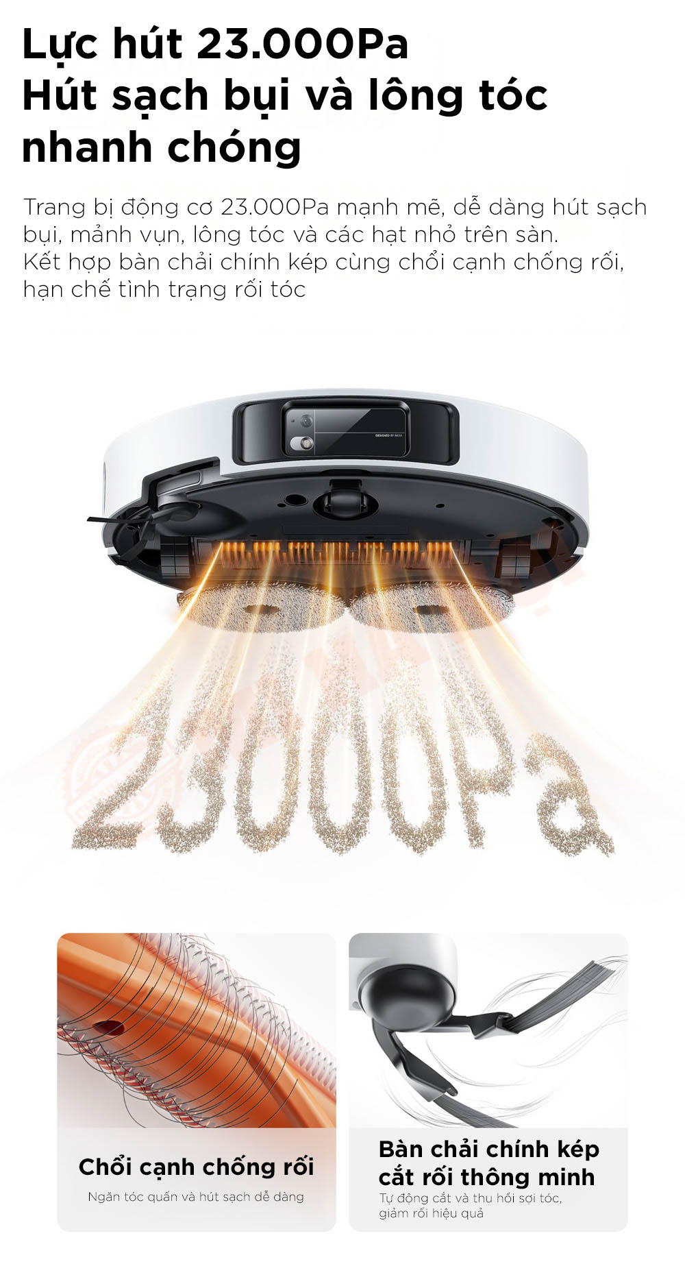 - Lực hút mạnh 23.000Pa – Hút sạch bụi, tóc, mảnh vụn chỉ trong tích tắc.