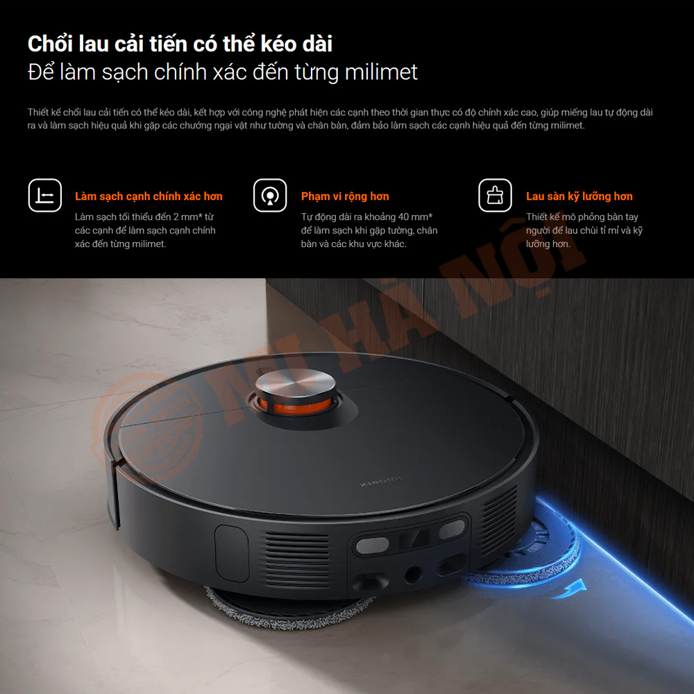 Để làm sạch chính xác đến từng milimet, Xiaomi đã thiết kế chổi lau cải tiến có thể kéo dài, kết hợp với công nghệ phát hiện các cạnh theo thời gian thực có độ chính xác cao, giúp miếng lau tự động dài ra và làm sạch hiệu quả khi gặp các chướng ngại vật như tường và chân bàn, đảm bảo làm sạch các cạnh hiệu quả đến từng milimet.