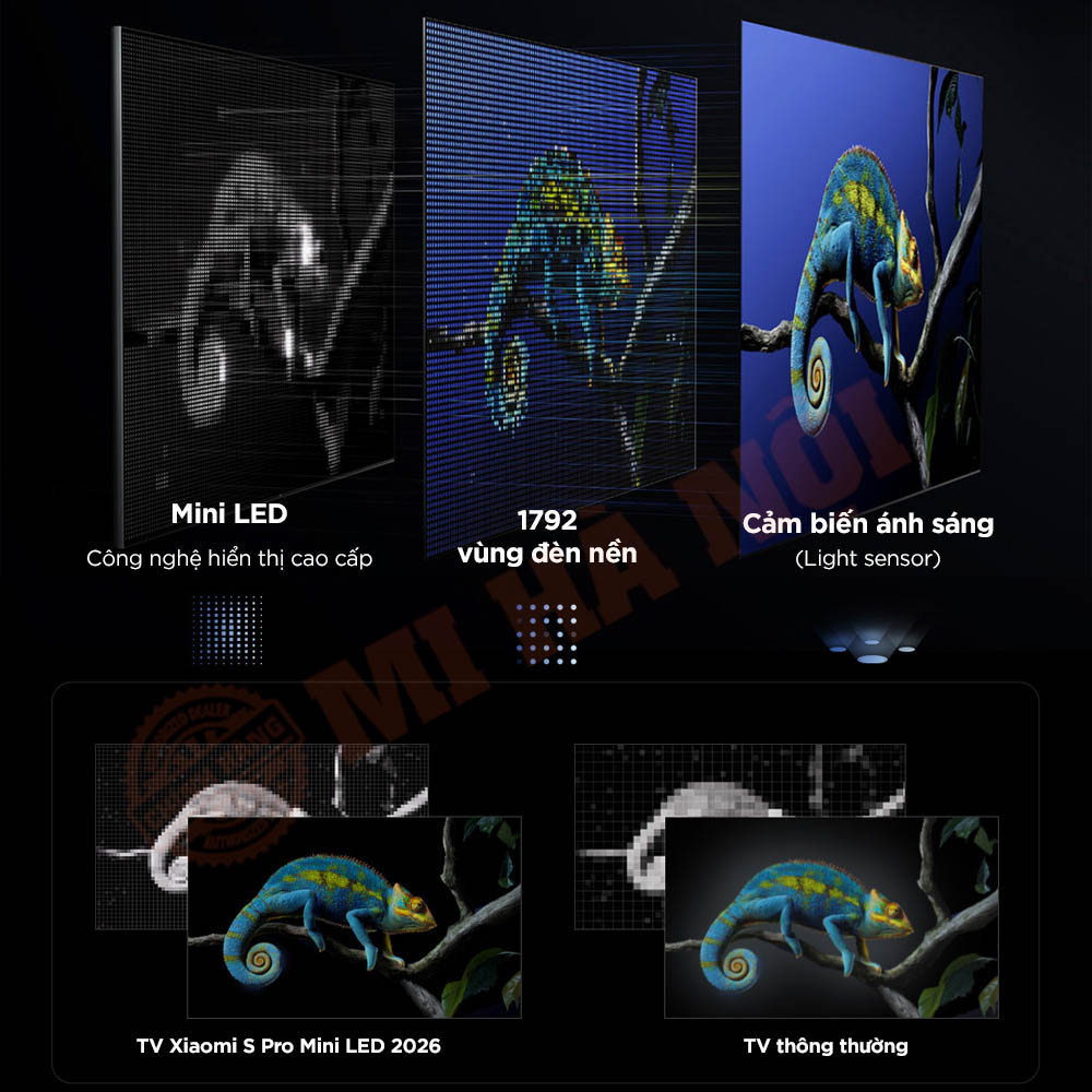 Tivi Xiaomi S Pro 65 Mini LED 2026 được trang bị tới 1792 vùng đèn nền cục bộ, giúp kiểm soát ánh sáng chính xác và tái hiện từng chi tiết sáng tối rõ rệt.