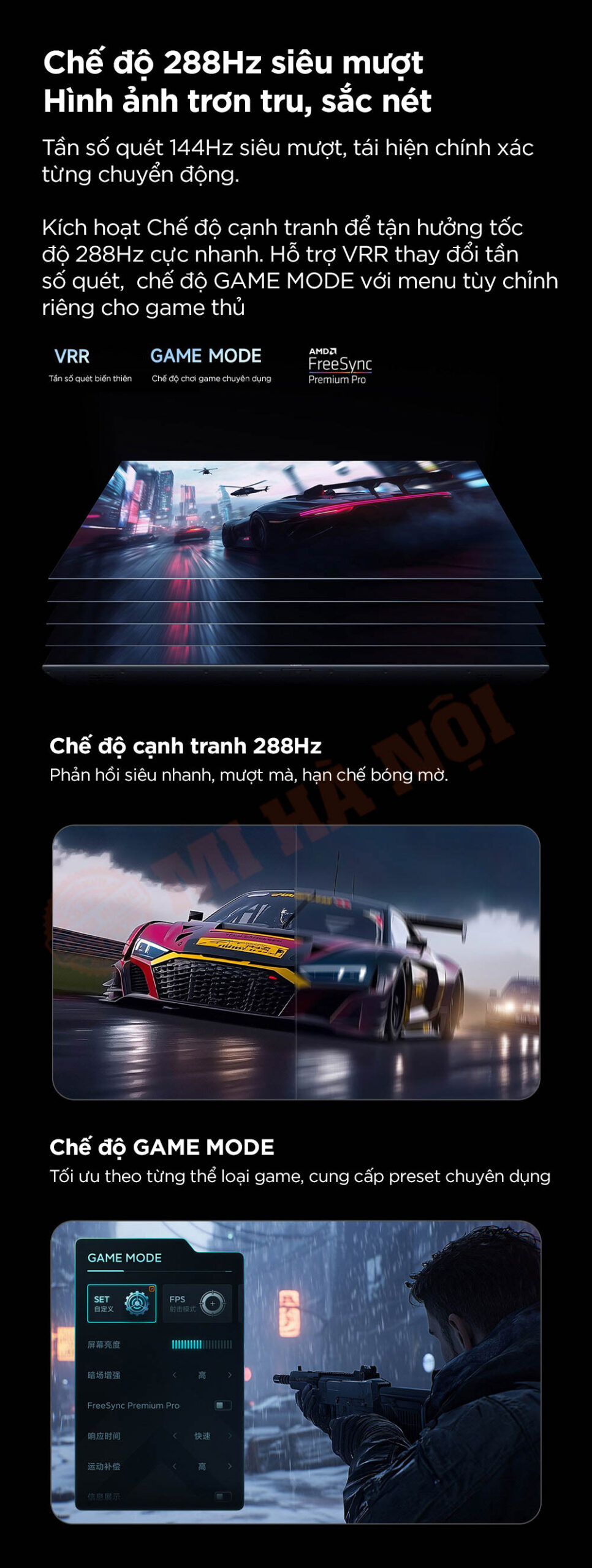 - Tần số quét siêu cao 288Hz, hỗ trợ 4K 144Hz.
