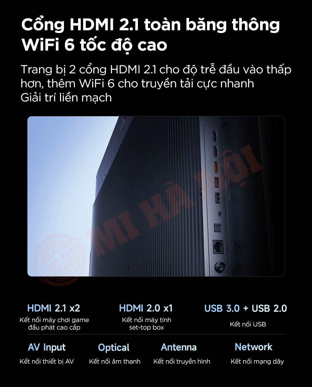 - Kết nối đa dạng: 2 cổng HDMI 2.1, HDMI 2.0, USB 3.0/2.0, AV, Optical, Antenna, Network.