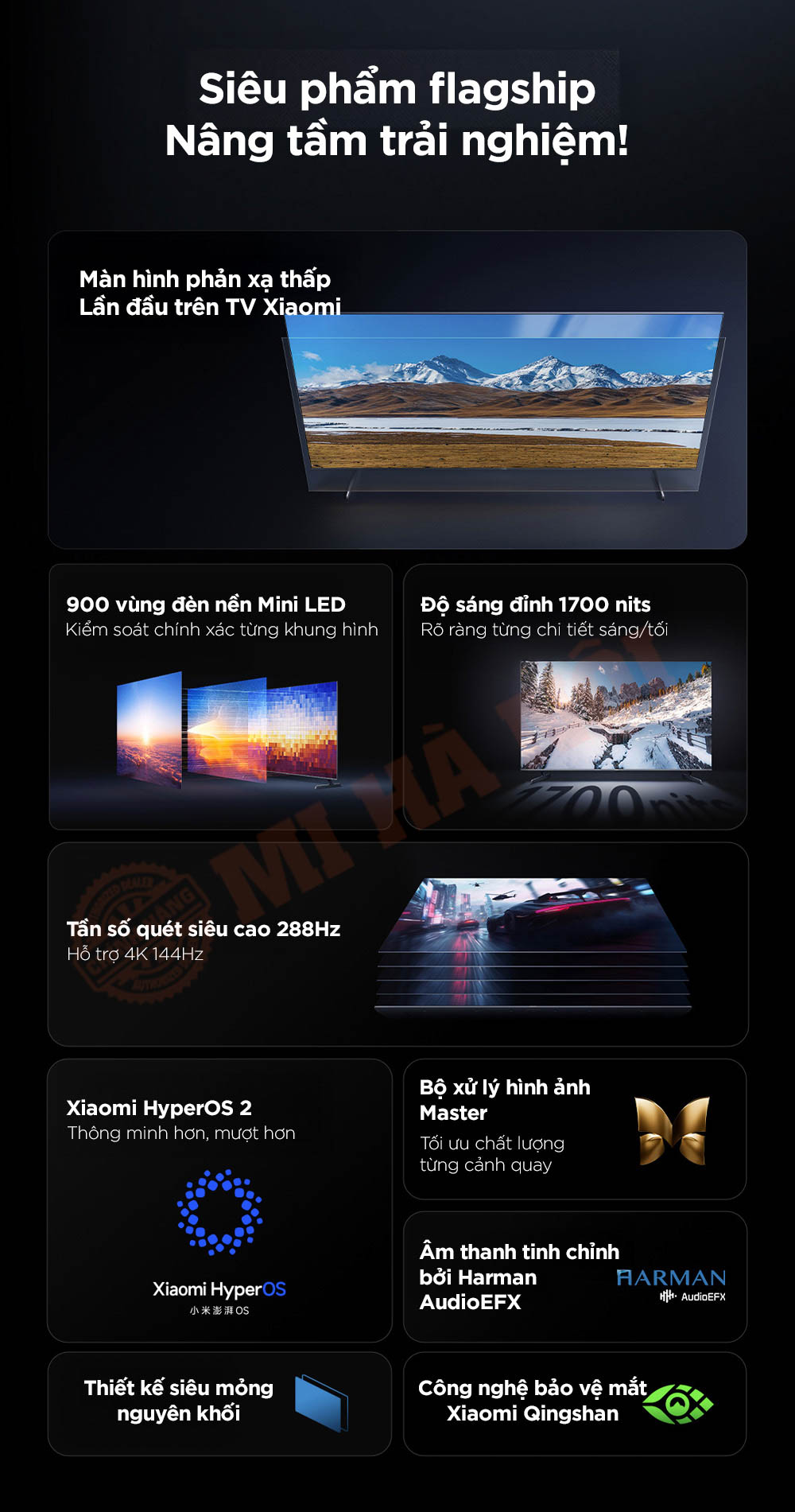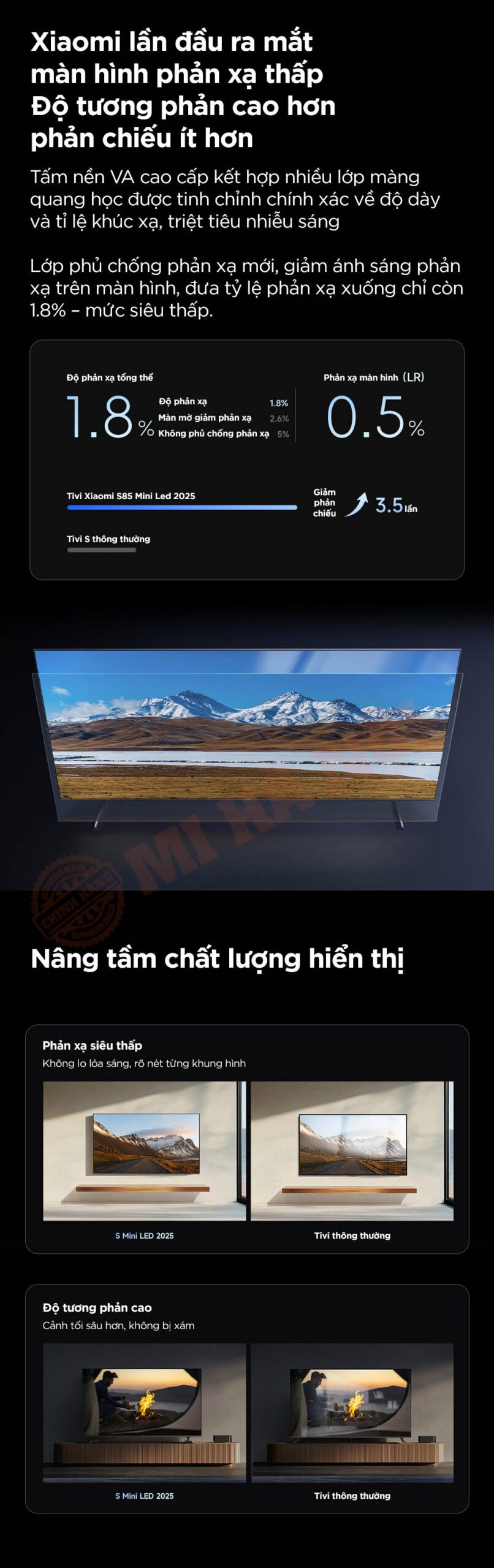 Trải nghiệm Tivi Xiaomi S85 Mini Led 2025 với màn hình phản xạ thấp, 900 vùng sáng Mini LED, độ sáng 1700 nits và tần số quét 288Hz. Âm thanh Harman sống động, công nghệ bảo vệ mắt Xiaomi QingShan, mang đến hình ảnh sắc nét và giải trí đỉnh cao ngay tại nhà.