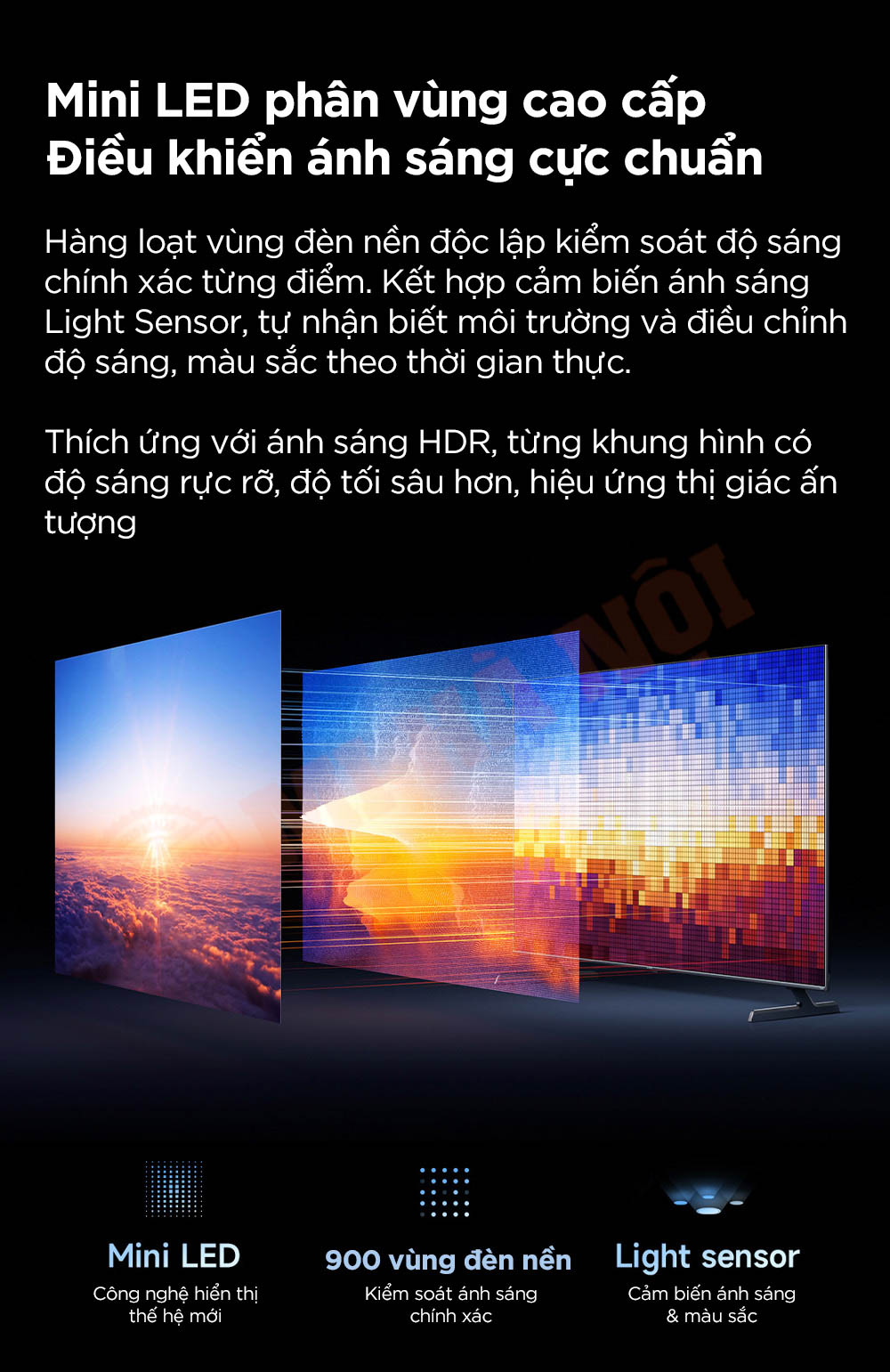 - 900 vùng đèn nền Mini LED, kiểm soát chính xác từng khung hình.
