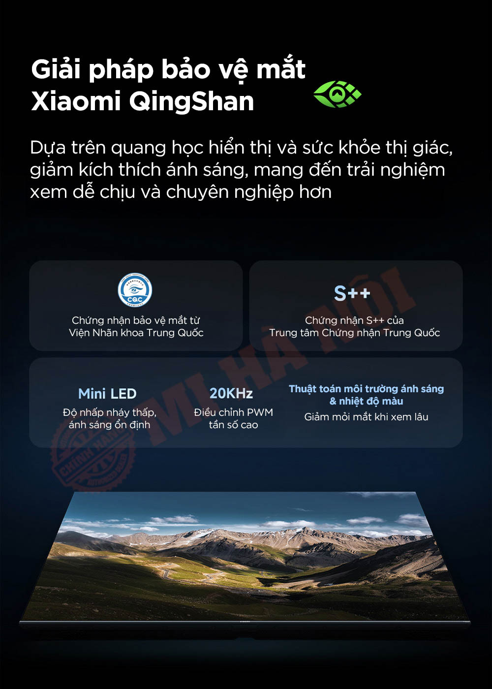 - Công nghệ bảo vệ mắt Xiaomi QingShan, giảm mỏi mắt khi xem lâu.