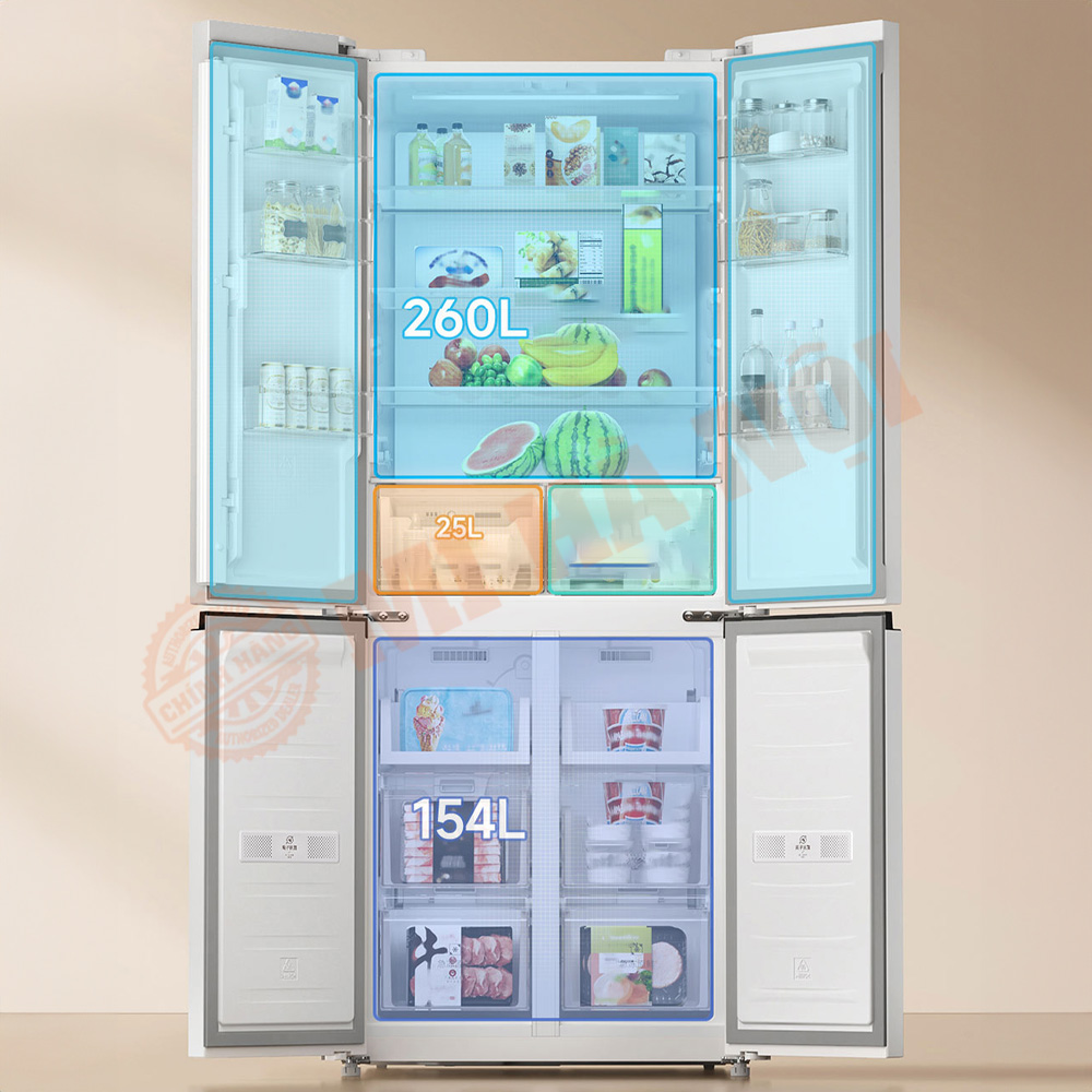 Tủ lạnh Xiaomi 4 cánh có dung tích lớn tới 439L, thiết kế 18 vách ngăn cửa chéo chia ra nhiều khu vực bảo quản khác nhau cho các nguyên liệu khác nhau như đồ khô, đồ tươi sống, đồ ướt, rau củ quả, đồ cho mẹ và bé… Đảm bảo mọi loại thực phẩm luôn tươi ngon, giữ nguyên chất dinh dưỡng và hương vị tươi ngon ban đầu.