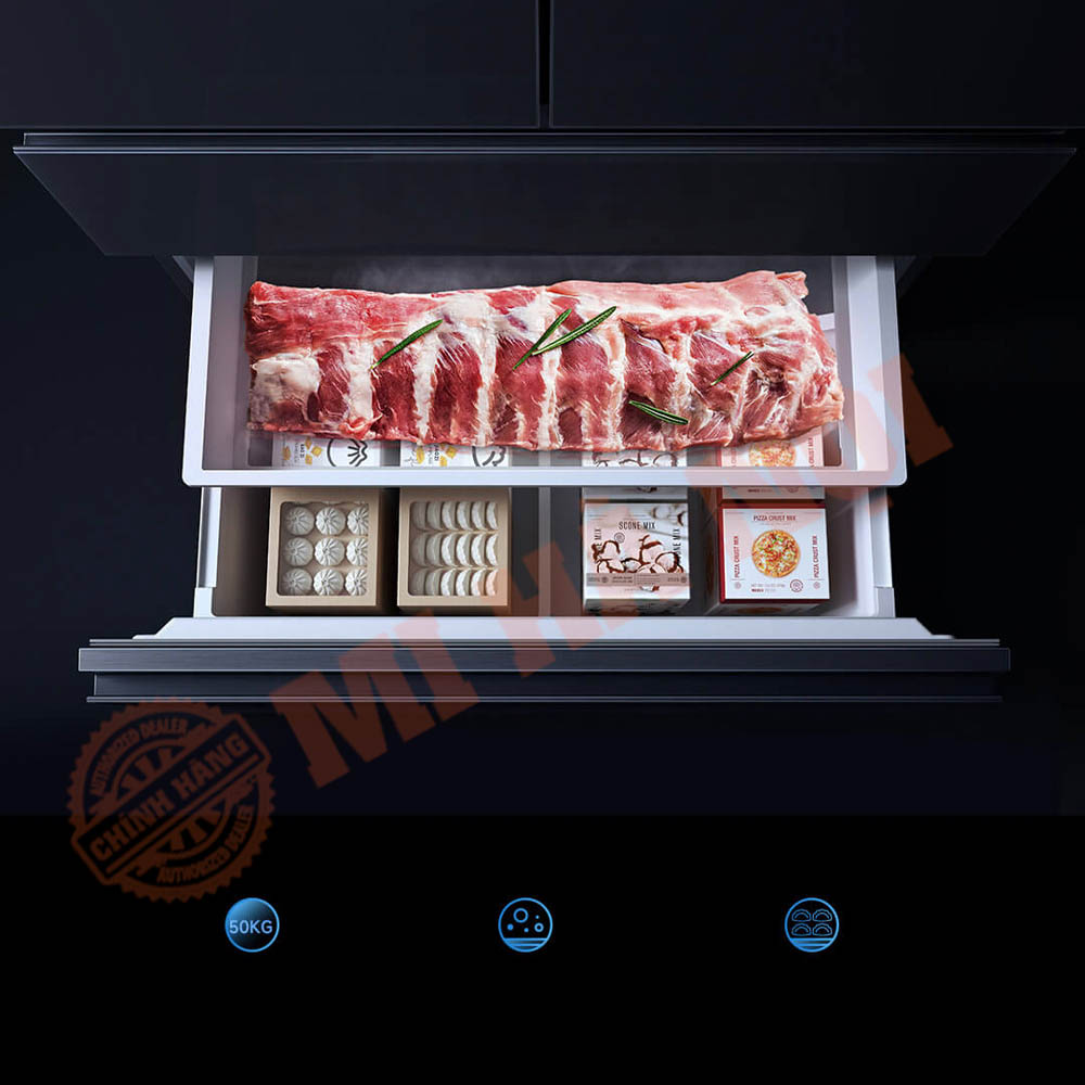 Tủ lạnh Xiaomi Mijia 506L Pro được thiết kế với ngăn đông dung tích lớn, cho phép bảo quản những thực phẩm kích thước “khủng” như đùi cừu, bít tết tomahawk hay sườn nguyên con mà không cần cắt nhỏ. Thiết kế dạng ngăn kéo giúp thao tác cất và lấy thực phẩm trở nên thuận tiện, nhanh chóng hơn.
