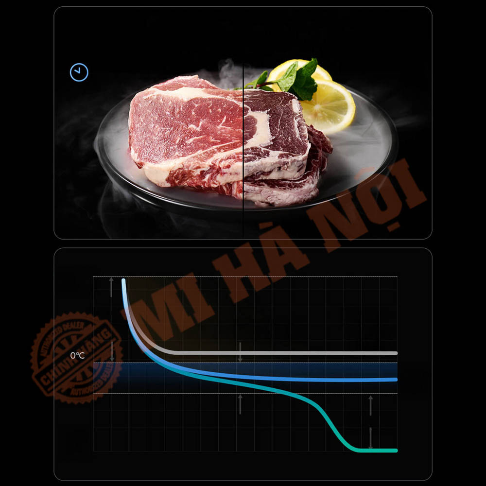 Tủ lạnh Xiaomi Mijia 560L Pro được trang bị công nghệ vi làm lạnh tiên tiến, được Viện Thiết bị Gia dụng chứng nhận về khả năng bảo quản siêu lạnh ở cấp độ tế bào. Nhờ kiểm soát nhiệt độ chính xác và duy trì độ ẩm ổn định, thịt tươi không bị đông cứng dù ở dưới 0°C, giữ nguyên độ mềm và hương vị tự nhiên.