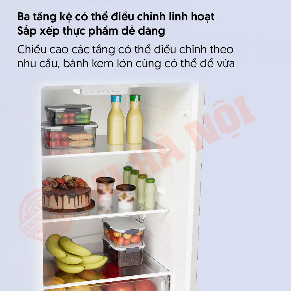 - Ba tầng kệ linh hoạt trong ngăn mát – có thể điều chỉnh độ cao theo nhu cầu, chứa vừa cả bánh kem lớn và nhiều loại thực phẩm khác nhau.