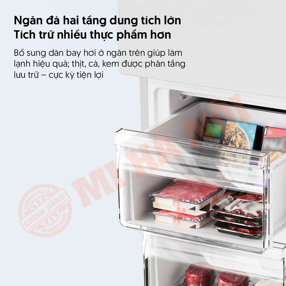- Ngăn đá hai tầng dung tích lớn – bố trí dàn bay hơi ở ngăn trên giúp làm lạnh đồng đều, phân tầng bảo quản tiện lợi.