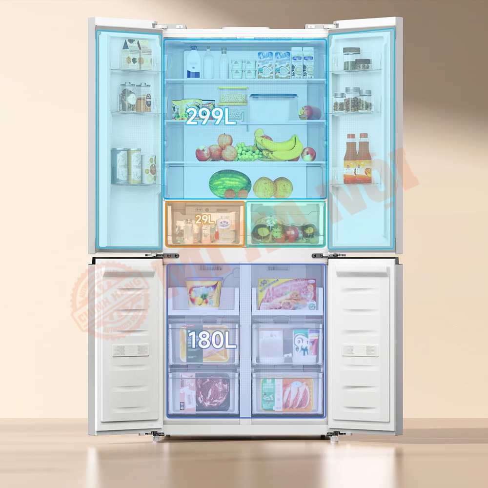Về dung tích, tủ lạnh Xiaomi này có sức chứa siêu lớn lên đến 508L. Trong đó, ngăn làm mát chiếm 299L, ngăn cấp đông 180L và ngăn bảo quản đồ khô và ướt cao cấp đặc biệt là 29L.