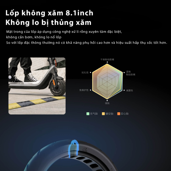 - Bánh xe 8.1 inch không xăm, không sợ thủng