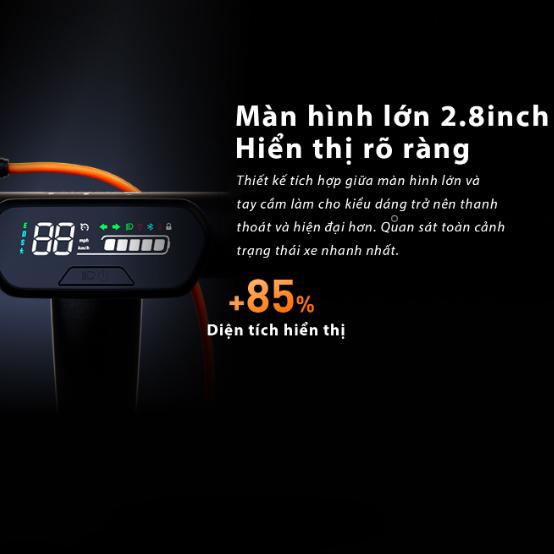 Dòng E2 Plus có thiết kế bảng điều khiển lớn hơn 2,8 inch, hiển thị nhanh các thông tin như tốc độ và mức pin! Góc nghiêng màn hình 25° được thiết kế công thái học để tạo sự thoải mái và dễ dàng quan sát khi đi xe.