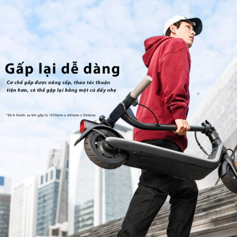 Ninebot E2 Plus gấp chỉ trong một bước. Bạn có thể dễ dàng mang theo khi đi thang máy, trên các phương tiện giao thông công cộng, cất giữ ở nơi làm việc/nhà riêng hoặc cho vào cốp xe ô tô.