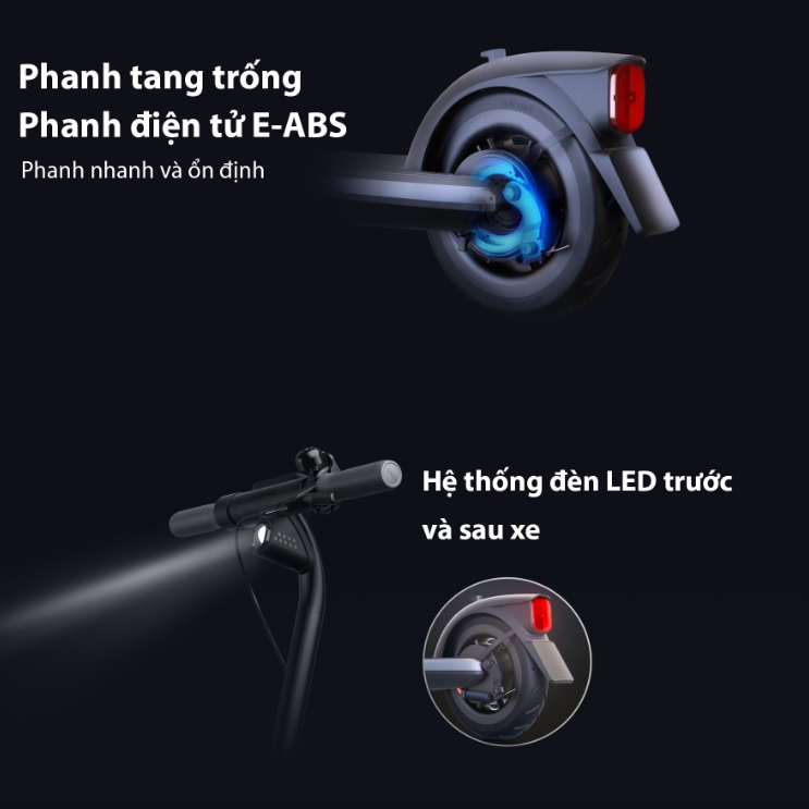 Ngoài ra, Ninebot E2 Plus còn đi kèm với đèn trước 2,1W, mang đến cho bạn tầm nhìn trong bóng tối tốt hơn với khoảng cách lên tới 13,5 mét. Để đảm bảo an toàn, đèn phanh sau và đèn phản quang được chứng nhận E-MARK sẽ đảm bảo bạn luôn được chú ý để tránh va chạm.