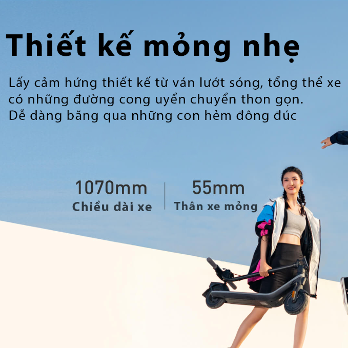 Thiết kế thời trang của Scooter Segway Ninebot E2 Plus được lấy cảm hứng từ phong cách lướt sóng, thể hiện sự háo hức khám phá của con người. Vẻ ngoài sành điệu của nó khiến bạn nổi bật giữa đám đông!