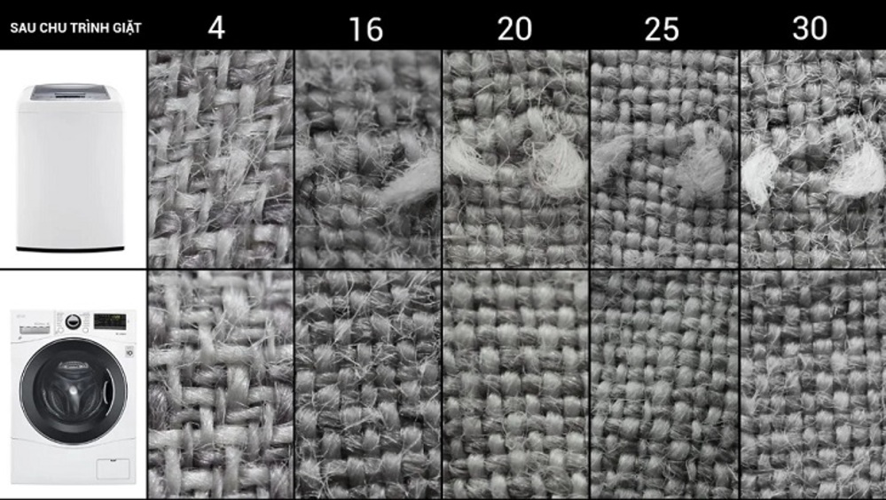 Một thí nghiệm đã được thực hiện nhằm so sánh khả năng bảo vệ sợi vải giữa máy giặt cửa trước và máy giặt cửa trên. Trong quá trình kiểm tra, các chuyên gia sử dụng nước giặt chuyên dụng và chế độ giặt bảo vệ vải tương ứng trên từng loại máy để đảm bảo tính khách quan.