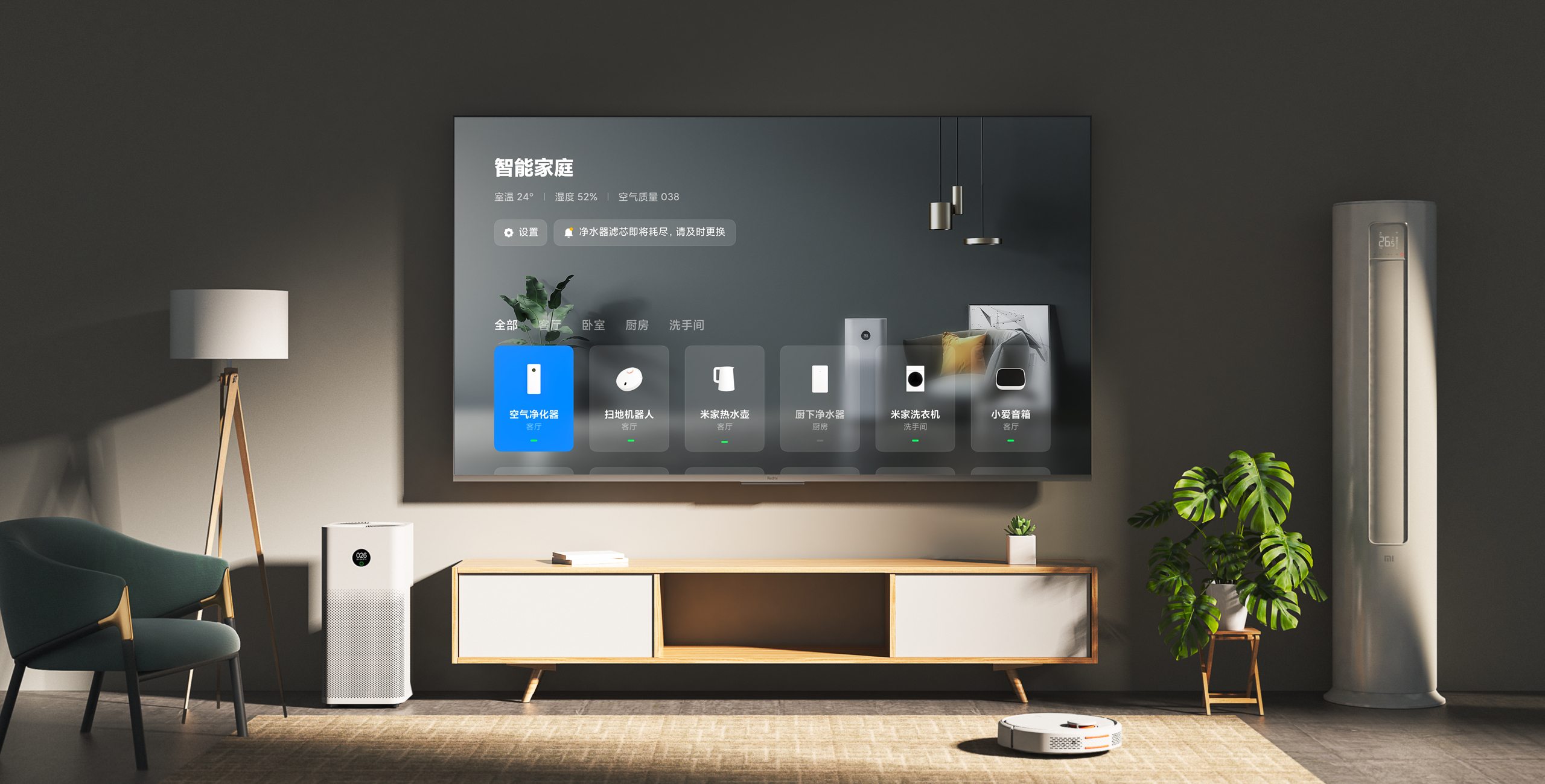 - Phòng khách: TV Xiaomi, điều hòa, đèn trần thông minh, robot hút bụi, loa AI….